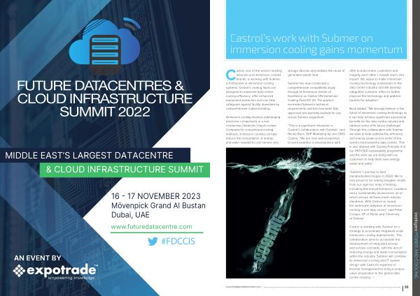 Castrol is working with Submer on a strategy to accelerate megawatt-scale immersion cooling deployments . This collaboration aims to accelerate the development of integrated energy and service concepts , with the aim of reducing energy and water consumption within the industry . Submer will combine its immersion cooling and IT system design with Castrol ’ s expertise in thermal management to bring a unique value proposition to the global data centre industry . � intelligent POWER AND COOLING www . intelligentdatacentres . com