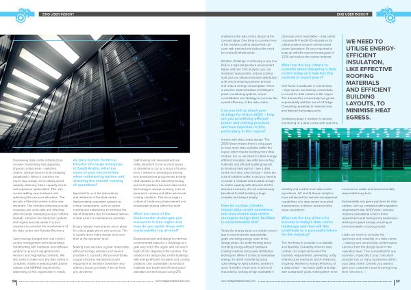 Sustainable build and design to minimise environmental impact is a challenge as it gets very hot in this region and can reach highs of 50 + degrees in the summer . The solution is to design data centre buildings with energy-efficient insulation and cooling solutions . Use sustainable construction materials and implement efficient space utilisation and techniques using CFD