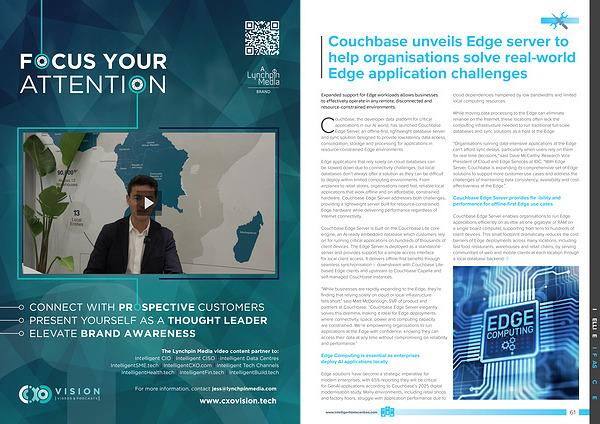 “ Organisations running data-intensive applications at the Edge can’ t afford sync delays, particularly when users rely on them for real-time decisions,” said Dave McCarthy, Research Vice President of Cloud and Edge Services at IDC.“ With Edge Server, Couchbase is expanding its comprehensive set of Edge solutions to support more customer use cases and address the challenges of maintaining data consistency, availability and costeffectiveness at the Edge.”