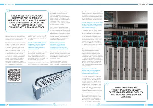This is where RPPs and busway systems fundamentally diverge. RPPs can be resource-intensive, requiring significant labour and time. To illustrate, an RPP system involves two physical locations: the RPP source and the final rack location. If power is needed for 20 racks in a row, you must route a single core cable 20 times from the RPP’ s physical location to 20 different racks. This process is labourintensive and time-consuming.